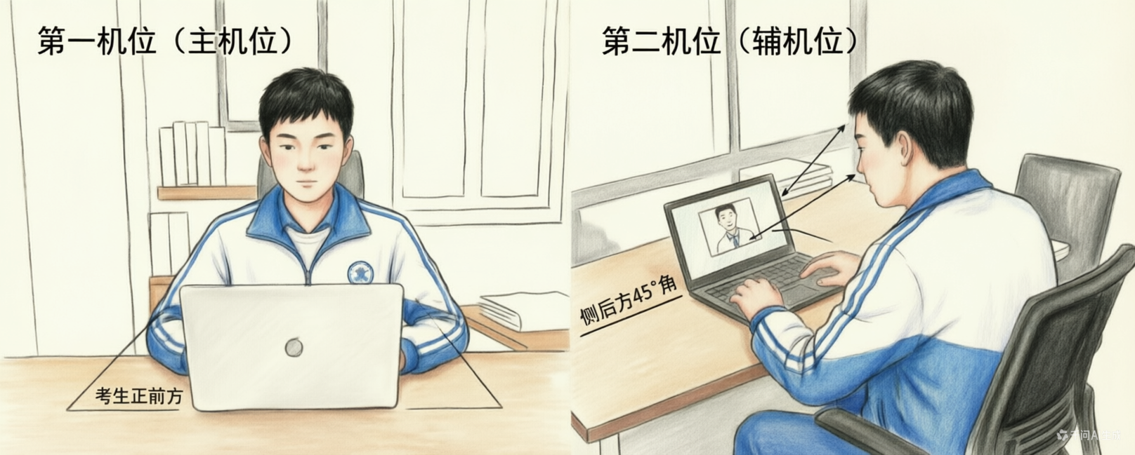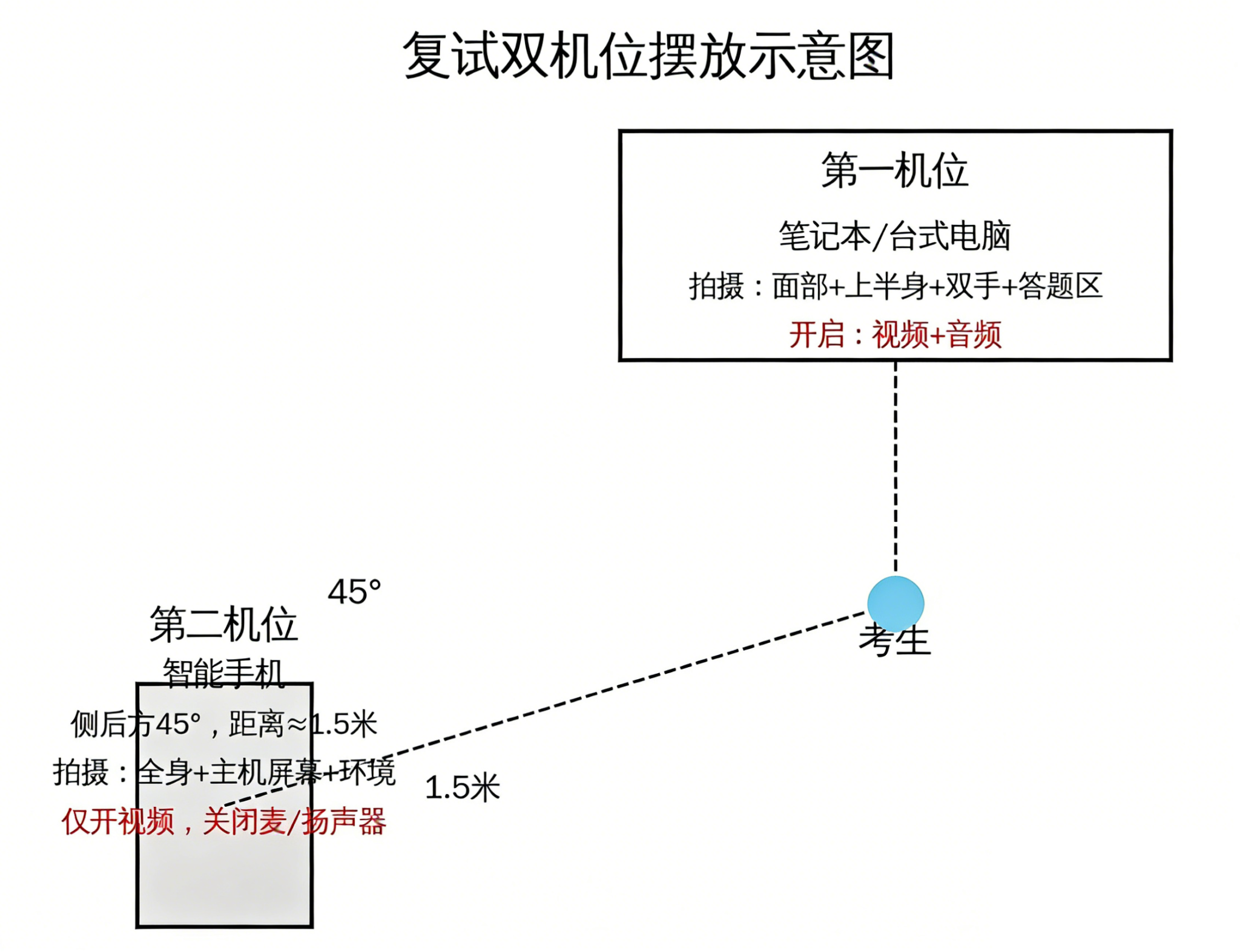第二机位(辅机位):用于复试全程监考与环境监控,须使用智能手机,放置于考生侧后方45°角、距离1.5米左右位置,确保可清晰拍摄到考生全身、主机位屏幕、周边应试环境,复试全程关闭麦克风与扬声器,仅开启视频功能,避免出现回音、干扰。复试双机位摆放示意图下。